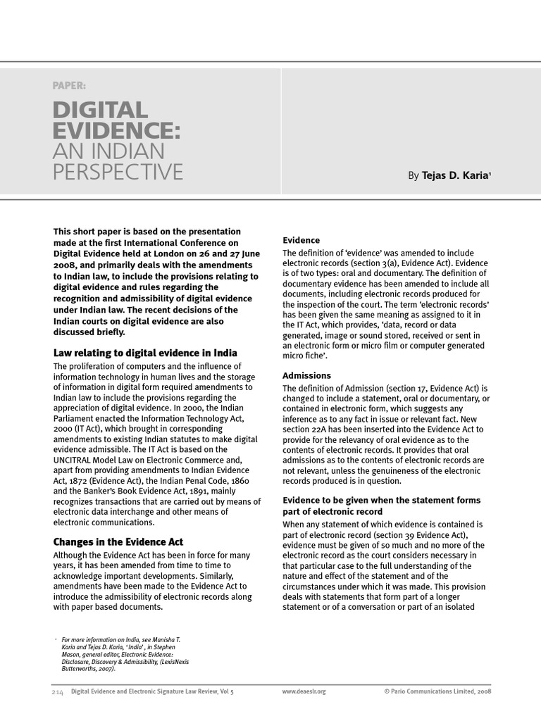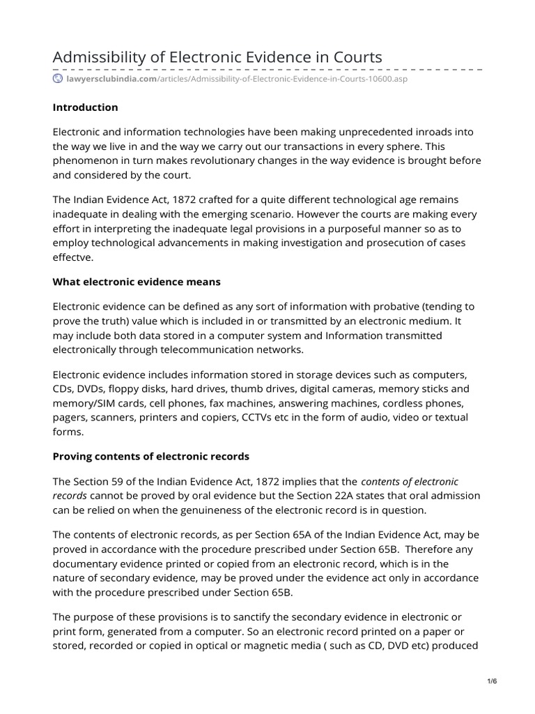 Admissibility Of Electronic Evidence In India : With the amendment to the indian evidence act in 2000, contents of electronic records may be admitted as evidence.
