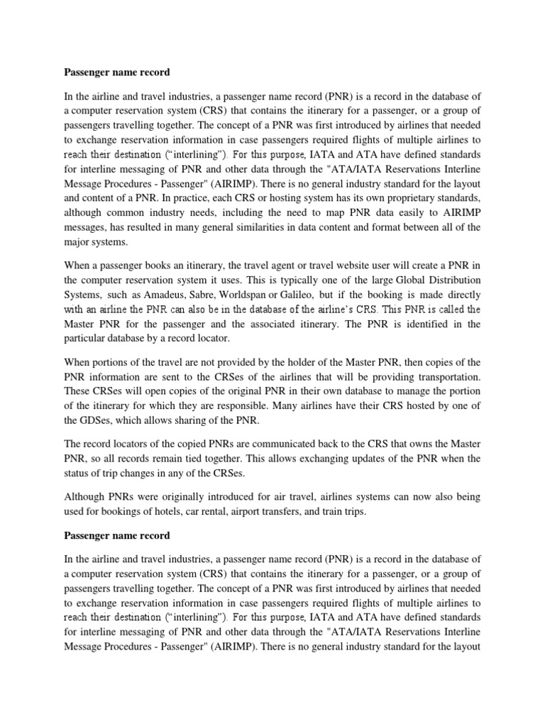 Passenger Name Record Information Technology Computer Data Pnr data collection varies from one airline to the next.