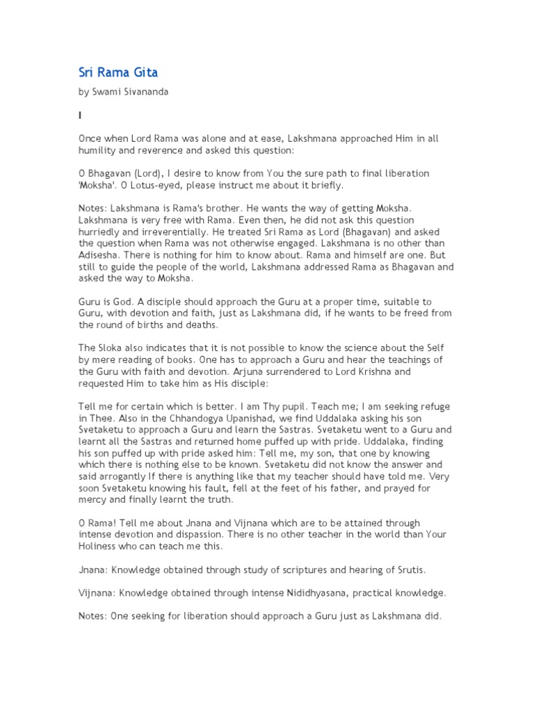 Sri Rama Gita - In the uttarakanda of the adhyatma ramayana, sri rama in the role of an ideal teacher, dispels the ignorance of his dear and devoted brother lakshmana.